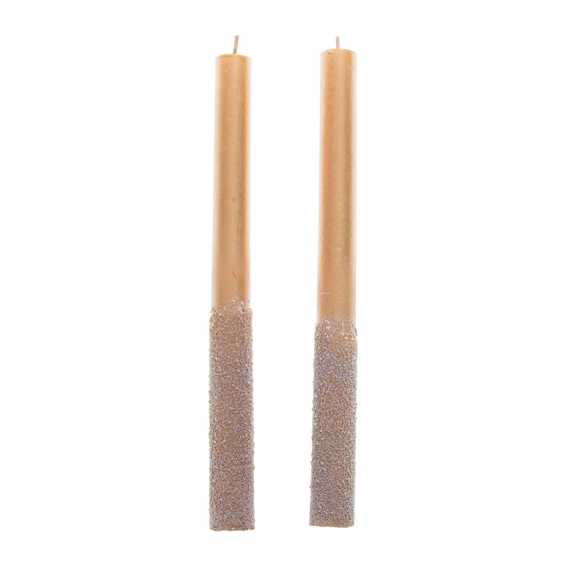 Set de 2 flambeaux en paraffine dorée, offrant une durée de combustion de 9 heures. Idéal pour enrichir une gamme de bougies décoratives haut de gamme, ce produit séduit par son aspect élégant et sa finition perlée.